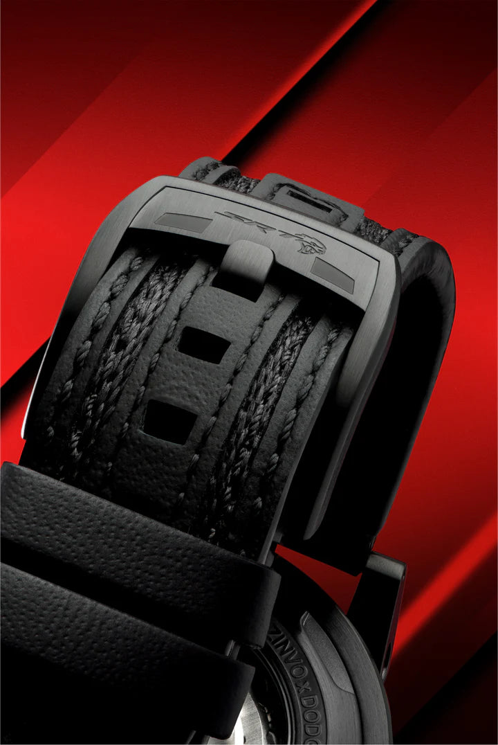 This collaboration is an exclusive ZINVO x DODGE timepiece that is limited to 500 pieces worldwide, featuring many design references from Dodge Challenger SRT Hellcat, including the same leather as the vehicles interior, the same seatbelt webbing, and many more.